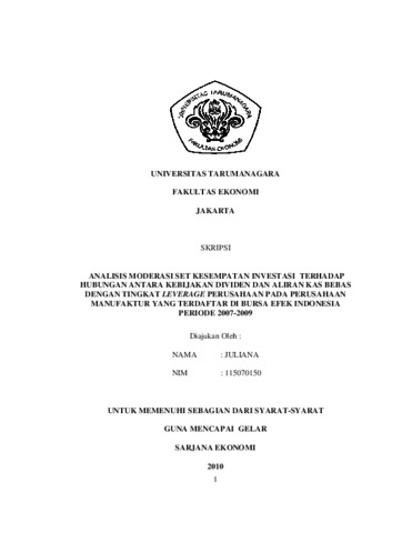 Juliana, Juliana (2010) ANALISIS MODERASI SET KESEMPATAN INVESTASI TERHADAP HUBUNGAN ANTARA KEBIJAKAN DIVIDEN DAN ALIRAN KAS BEBAS DENGAN TINGKAT LEVERAGE PERUSAHAAN PADA PERUSAHAAN MANUFAKTUR YANG TERDAFTAR DI BURSA EFEK INDONESIA PERIODE 2007-2009. Skripsi thesis, UNIVERSITAS TARUMANAGARA.