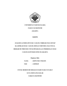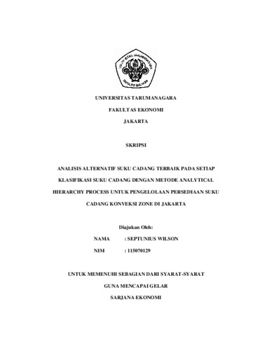 Wilson, Septunius (2011) ANALISIS ALTERNATIF SUKU CADANG TERBAIK PADA SETIAP KLASIFIKASI SUKU CADANG DENGAN METODE ANALYTICAL HIERARCHY PROCESS UNTUK PENGELOLAAN PERSEDIAAN SUKU CADANG KONVEKSI ZONE DI JAKARTA. Skripsi thesis, UNIVERSITAS TARUMANAGARA.