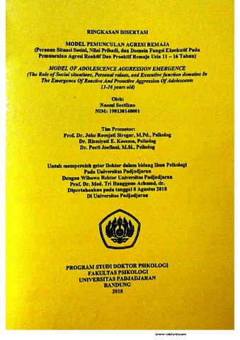Soetikno, Naomi (2023) MODEL PEMUNCULAN AGRESI REMAJA (Peranan Situasi Sosial, Nilai Pribadi, dan Domain Fungsi Eksekutif Pada Pemunculan Agresi Reaktif Dan Proaktif Remaja Usia 11 – 16 Tahun). Doctoral thesis, Universitas Padjadjaran.
