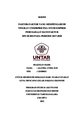 MANALU, AGATHA (2022) FAKTOR-FAKTOR YANG MEMPENGARUHI TINGKAT UNDERPRICING: STUDI EMPIRIS PERUSAHAAN MANUFAKTUR IPO DI BEI PADA PERIODE 2017- 2020. Skripsi thesis, Universitas Tarumanagara.