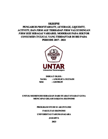 Suciadi, Angelica (2023) PENGARUH PROFITABILITY, LEVERAGE, LIQUIDITY, ACTIVITY, DAN FIRM AGE TERHADAP FIRM VALUE DENGAN FIRM SIZE SEBAGAI VARIABEL MODERASI PADA SEKTOR CONSUMER CYCLICAL YANG TERDAFTAR DI BEI PADA PERIODE 2017 - 2021. Skripsi thesis, Universitas Tarumanagara.