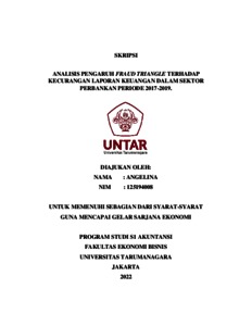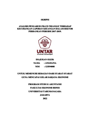 Angelina, Angelina (2022) ANALISIS PENGARUH FRAUD TRIANGLE TERHADAP KECURANGAN LAPORAN KEUANGAN DALAM SEKTOR PERBANKAN YANG TERDAFTAR DI BURSA EFEK INDONESIA TAHUN 2017-2019. Skripsi thesis, Universitas Tarumanagara.