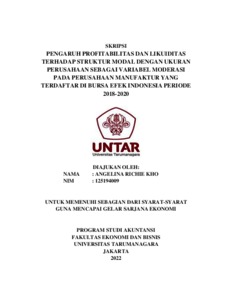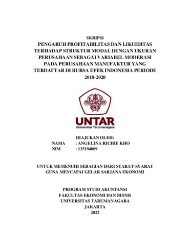 Richie, Angelina (2022) PENGARUH PROFITABILITAS DAN LIKUIDITAS TERHADAP STRUKTUR MODAL DENGAN UKURAN PERUSAHAAN SEBAGAI VARIABEL MODERASI PADA PERUSAHAAN MANUFAKTUR YANG TERDAFTAR DI BURSA EFEK INDONESIA PERIODE 2018-2020. Skripsi thesis, Universitas Tarumanagara.