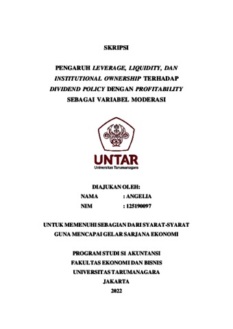 ANGELLIA, ANGELLIA (2022) PENGARUH LEVERAGE, LIQUIDITY, DAN INSTITUTIONAL OWNERSHIP TERHADAP DIVIDEND POLICY DENGAN PROFITABILITY SEBAGAI VARIABEL MODERASI. Skripsi thesis, Universitas Tarumanagara.