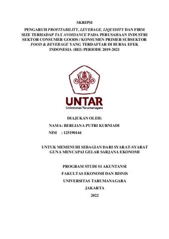 Putri, Berliana (2022) PENGARUH PROFITABILITY, LEVERAGE, LIQUIDITY DAN FIRM SIZE TERHADAP TAX AVOIDANCE PADA PERUSAHAAN INDUSTRI SEKTOR CONSUMER GOODS / KONSUMEN PRIMER SUBSEKTOR FOOD & BEVERAGE YANG TERDAFTAR DI BURSA EFEK INDONESIA (BEI) PERIODE 2019-2021. Skripsi thesis, Universitas Tarumanagara.
