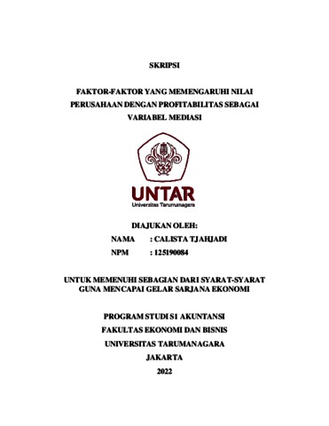 Tjahjadi, Calista (2022) FAKTOR-FAKTOR YANG MEMENGARUHI NILAI PERUSAHAAN DENGAN PROFITABILITAS SEBAGAI VARIABEL MEDIASI. Skripsi thesis, Universitas Tarumanagara.