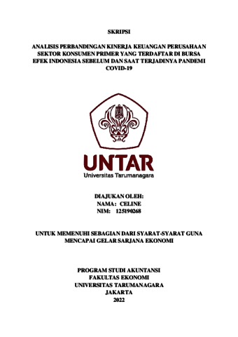 CELINE, CELINE (2022) ANALISIS PERBANDINGAN KINERJA KEUANGAN PERUSAHAAN SEKTOR KONSUMEN PRIMER YANG TERDAFTAR DI BURSA EFEK INDONESIA SEBELUM DAN SAAT TERJADINYA PANDEMI COVID-19. Skripsi thesis, Universitas Tarumanagara.
