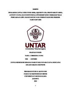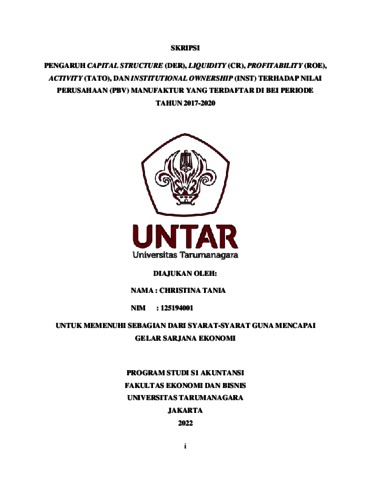Tania, Christina (2022) PENGARUH CAPITAL STRUCTURE (DER), LIQUIDITY (CR), PROFITABILITY (ROE), ACTIVITY (TATO), DAN INSTITUTIONAL OWNERSHIP (INST) TERHADAP NILAI PERUSAHAAN (PBV) MANUFAKTUR YANG TERDAFTAR DI BEI PERIODE TAHUN 2017-2020. Skripsi thesis, Universitas Tarumanagara.