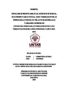 Junika, Christine (2023) PENGARUH PROFITABILITAS, STRUKTUR MODAL, DAN PERPUTARAN TOTAL ASET TERHADAP NILAI PERUSAHAAN DENGAN NILAI TUKAR SEBAGAI VARIABEL MODERASI (STUDI PADA PERUSAHAAN INFRASTRUKTUR YANG TERDAFTAR DI BURSA EFEK INDONESIA TAHUN 2018- 2021). Skripsi thesis, Universitas Tarumanagara.