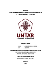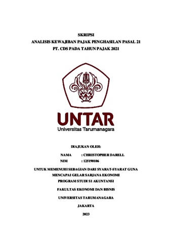 Darell, Christopher (2023) ANALISIS KEWAJIBAN PAJAK PENGHASILAN PASAL 21 PT. CDS PADA TAHUN PAJAK 2021. Skripsi thesis, Universitas Tarumanagara.