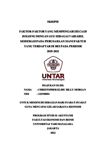 Elihu, Christopher (2022) FAKTOR-FAKTOR YANG MEMPENGARUHI CASH HOLDING DENGAN GCG SEBAGAI VARIABEL MODERASI PADA PERUSAHAAN MANUFAKTUR YANG TERDAFTAR DI BEI PADA PERIODE 2019-2021. Skripsi thesis, Universitas Tarumanagara.