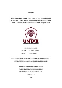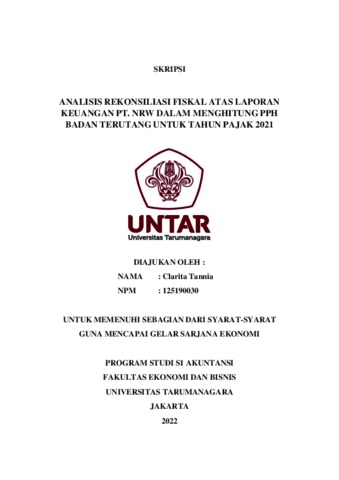 Tannia, Clarita (2022) ANALISIS REKONSILIASI FISKAL ATAS LAPORAN KEUANGAN PT. NRW DALAM MENGHITUNG PPH BADAN TERUTANG UNTUK TAHUN PAJAK 2021. Skripsi thesis, Universitas Tarumanagara.