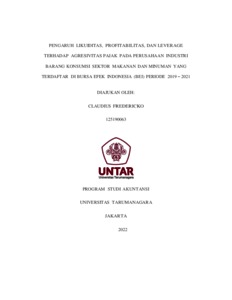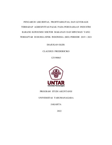 Frederico, Claudius (2022) PENGARUH LIKUIDITAS, PROFITABILITAS, DAN LEVERAGE TERHADAP AGRESIVITAS PAJAK PADA PERUSAHAAN INDUSTRI BARANG KONSUMSI SEKTOR MAKANAN DAN MINUMAN YANG TERDAFTAR DI BURSA EFEK INDONESIA (BEI) PERIODE 2019 – 2021. Skripsi thesis, Universitas Tarumanagara.