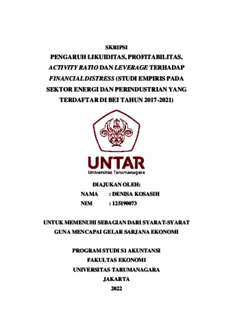 Kokasih, Denisa (2022) PENGARUH LIKUIDITAS, PROFITABILITAS, ACTIVITY RATIO DAN LEVERAGE TERHADAP FINANCIAL DISTRESS (STUDI EMPIRIS PADA SEKTOR ENERGI DAN PERINDUSTRIAN YANG TERDAFTAR DI BEI TAHUN 2017-2021). Skripsi thesis, Universitas Tarumanagara.