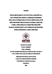 Edbert, Edbert (2022) PENGARUH GREEN ACCOUNTING, LIKUIDITAS, DAN STRUKTUR MODAL TERHADAP KINERJA KEUANGAN PERUSAHAAN PADA PERUSAHAAN DI SEKTOR INDSUTRI DASAR DAN KIMIA, SEKTOR ANEKA INDUSTRI, DAN SEKTOR INDUSTRI BARANG KONSUMSI YANG TERDAFTAR DI BURSA EFEK INDONESIA TAHUN 2019-2021. Skripsi thesis, Universitas Tarumanagara.