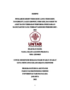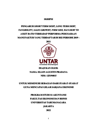 Agustin, Ellen (2022) PENGARUH SHORT TERM DEBT, LONG TERM DEBT, TANGIBILITY, SALES GROWHT, FIRM SIZE, DAN DEBT TO ASSET RATIO TERHADAP PERFORMA PERUSAHAAN MANUFAKTUR YANG TERDAFTAR DI BEI PERIODE 2019 - 2021. Skripsi thesis, Universitas Tarumanagara.