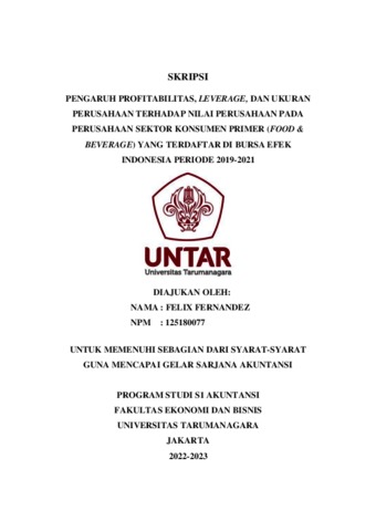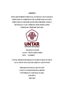 Fernandez, Felix (2022) PENGARUH PROFITABILITAS, LEVERAGE, DAN UKURAN PERUSAHAAN TERHADAP NILAI PERUSAHAAN PADA PERUSAHAAN SEKTOR KONSUMEN PRIMER (FOOD & BEVERAGE) YANG TERDAFTAR DI BURSA EFEK INDONESIA PERIODE 2019-2021. Skripsi thesis, Universitas Tarumanagara.