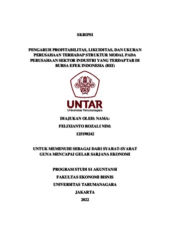 Rozali, Felixianto (2022) PENGARUH PROFITABILITAS, LIKUIDITAS, DAN UKURAN PERUSAHAAN TERHADAP STRUKTUR MODAL PADA PERUSAHAAN SEKTOR INDUSTRI YANG TERDAFTAR DI BURSA EFEK INDONESIA (BEI). Skripsi thesis, Universitas Tarumanagara.