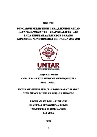 Febryan, Fransiscus (2023) PENGARUH PERSISTENSI LABA, LIKUIDITAS DAN EARNINGS POWER TERHADAP KUALITAS LABA PADA PERUSAHAAN SEKTOR BARANG KONSUMEN NON-PRIMER DI BEI TAHUN 2019-2021. Skripsi thesis, Universitas Tarumanagara.