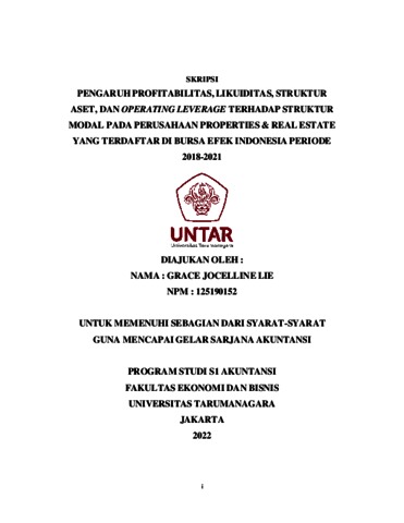 Jocelline, Grace (2022) PENGARUH PROFITABILITAS, LIKUIDITAS, STRUKTUR ASET, DAN OPERATING LEVERAGE TERHADAP STRUKTUR MODAL PADA PERUSAHAAN PROPERTIES & REAL ESTATE YANG TERDAFTAR DI BURSA EFEK INDONESIA PERIODE 2018-2021. Skripsi thesis, Universitas Tarumanagara.