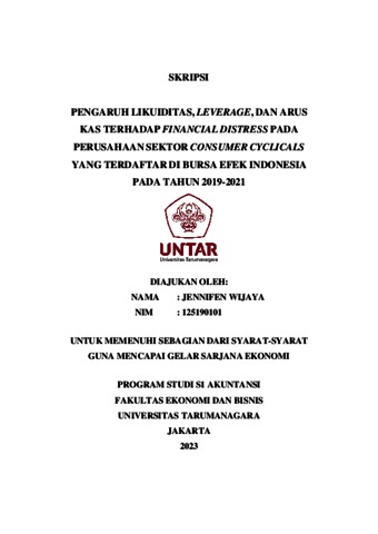 Wijaya, Jennifen (2023) PENGARUH LIKUIDITAS, LEVERAGE, DAN ARUS KAS TERHADAP FINANCIAL DISTRESS PADA PERUSAHAAN SEKTOR CONSUMER CYCLICALS YANG TERDAFTAR DI BURSA EFEK INDONESIA PADA TAHUN 2019-2021. Skripsi thesis, Universitas Tarumanagara.