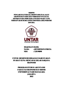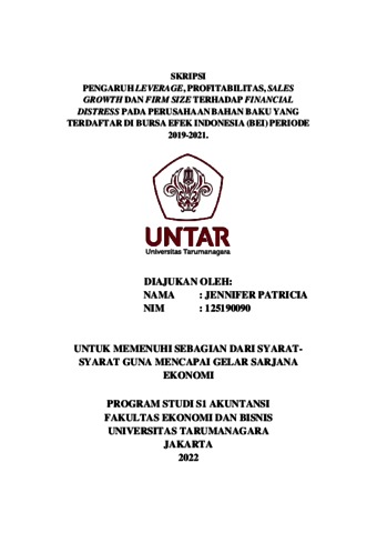 Patricia, Jennifer (2022) PENGARUH LEVERAGE, PROFITABILITAS, SALES GROWTH DAN FIRM SIZE TERHADAP FINANCIAL DISTRESS PADA PERUSAHAAN BAHAN BAKU YANG TERDAFTAR DI BURSA EFEK INDONESIA (BEI) PERIODE 2019-2021. Skripsi thesis, Universitas Tarumanagara.