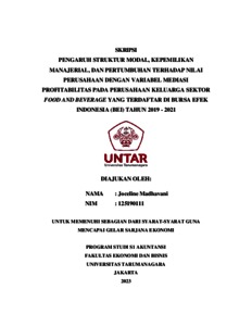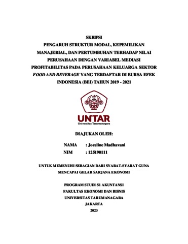 Madhavani, Joceline (2023) PENGARUH STRUKTUR MODAL, KEPEMILIKAN MANAJERIAL, DAN PERTUMBUHAN TERHADAP NILAI PERUSAHAAN DENGAN VARIABEL MEDIASI PROFITABILITAS PADA PERUSAHAAN KELUARGA SEKTOR FOOD AND BEVERAGE YANG TERDAFTAR DI BURSA EFEK INDONESIA (BEI) TAHUN 2019 - 2021. Skripsi thesis, Universitas Tarumanagara.