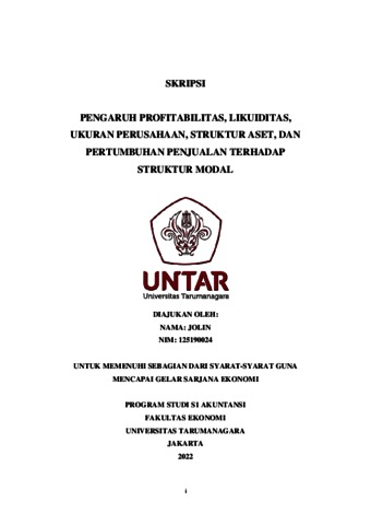 Jolin, Jolin (2022) PENGARUH PROFITABILITAS, LIKUIDITAS, UKURAN PERUSAHAAN, STRUKTUR ASET, DAN PERTUMBUHAN PENJUALAN TERHADAP STRUKTUR MODAL. Skripsi thesis, Universitas Tarumanagara.