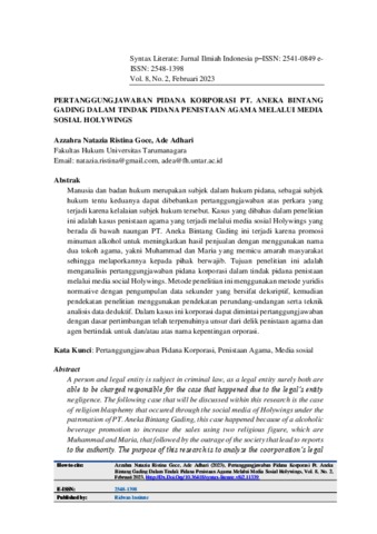 Goce, Azzahra Natazia Ristina and Adhari, Ade (2023) Pertanggungjawaban Pidana Korporasi PT. Aneka Bintang Gading dalam Tindak Pidana Penistaan Agama Melalui Media Sosial Holywings. Syntax Literate: Jurnal Ilmiah Indonesia, 8 (2). ISSN p–ISSN: 2541-0849; e-ISSN: 2548-1398
