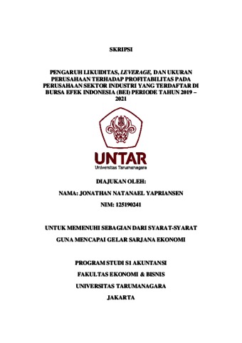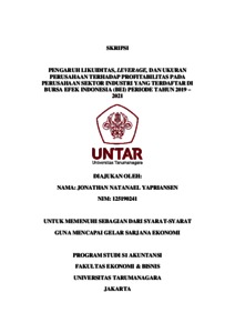 Natanael, Jonathan (2023) PENGARUH LIKUIDITAS, LEVERAGE, DAN UKURAN PERUSAHAAN TERHADAP PROFITABILITAS PADA PERUSAHAAN SEKTOR INDUSTRI YANG TERDAFTAR DI BURSA EFEK INDONESIA (BEI) PERIODE TAHUN 2019 – 2021. Skripsi thesis, Universitas Tarumanagara.