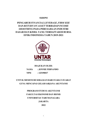 Fernando, Jonnie (2022) PENGARUH FINANCIAL LEVERAGE, FIRM SIZE DAN RETURN ON ASSET TERHADAP INCOME SMOOTHING PADA PERUSAHAAN INDUSTRI DASAR DAN KIMIA YANG TERDAFTAR DI BURSA EFEK INDONESIA TAHUN 2019-2021. Skripsi thesis, Universitas Tarumanagara.