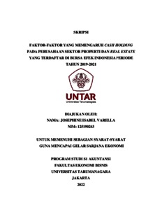 Isabel, Josephine (2022) FAKTOR-FAKTOR YANG MEMENGARUHI CASH HOLDING PADA PERUSAHAAN SEKTOR PROPERTI DAN REAL ESTATE YANG TERDAFTAR DI BURSA EFEK INDONESIA PERIODE TAHUN 2019-2021. Skripsi thesis, Universitas Tarumanagara.