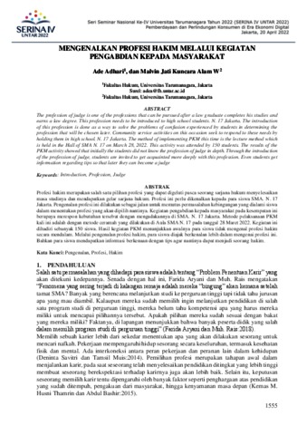Adhari, Ade and Malvin, Jati Kuncara Alam W (2022) Mengenalkan Profesi Hakim Melalui Kegiatan Pengabdian Kepada Masyarakat. Seri Seminar Nasional Universitas Tarumanagara (SERINA UNTAR 2022).