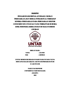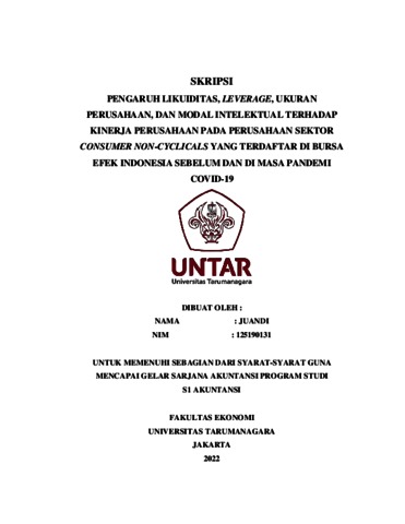 Juandi, Juandi (2022) PENGARUH LIKUIDITAS, LEVERAGE, UKURAN PERUSAHAAN, DAN MODAL INTELEKTUAL TERHADAP KINERJA PERUSAHAAN PADA PERUSAHAAN SEKTOR CONSUMER NON-CYCLICALS YANG TERDAFTAR DI BURSA EFEK INDONESIA SEBELUM DAN DI MASA PANDEMI COVID-19. Skripsi thesis, Universitas Tarumanagara.