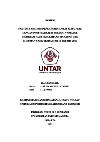 Agustilia, Kezia (2022) FAKTOR YANG MEMPENGARUHI CAPITAL STRUCTURE DENGAN PROFITABILITAS SEBAGAI VARIABEL MODERASI PADA PERUSAHAAN MAKANAN DAN MINUMAN YANG TERDAFTAR DI BEI 2019-2021. Skripsi thesis, Universitas Tarumanagara.