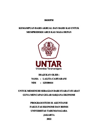 Cahyarani, Lalita (2022) KEMAMPUAN BASIS AKRUAL DAN BASIS KAS UNTUK MEMPREDIKSI ARUS KAS MASA DEPAN. Skripsi thesis, Universitas Tarumanagara.
