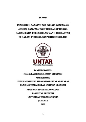 Jason, Laurensius (2022) PENGARUH EARNING PER SHARE, RETURN ON ASSETS, DAN FIRM SIZE TERHADAP HARGA SAHAM PADA PERUSAHAAN YANG TERDAFTAR DI DALAM INDEKS LQ45 PERIODE 2019-2021. Skripsi thesis, Universitas Tarumanagara.