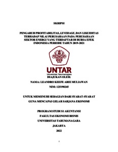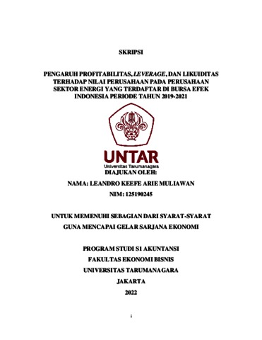 Keefe, Leandro (2022) PENGARUH PROFITABILITAS, LEVERAGE, DAN LIKUIDITAS TERHADAP NILAI PERUSAHAAN PADA PERUSAHAAN SEKTOR ENERGI YANG TERDAFTAR DI BURSA EFEK INDONESIA PERIODE TAHUN 2019-2021. Skripsi thesis, Universitas Tarumanagara.