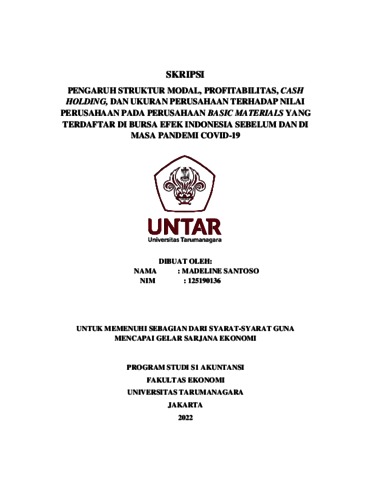 Santoso, Madeline (2022) PENGARUH STRUKTUR MODAL, PROFITABILITAS, CASH HOLDING, DAN UKURAN PERUSAHAAN TERHADAP NILAI PERUSAHAAN PADA PERUSAHAAN BASIC MATERIALS YANG TERDAFTAR DI BURSA EFEK INDONESIA SEBELUM DAN DI MASA PANDEMI COVID-19. Skripsi thesis, Universitas Tarumanagara.
