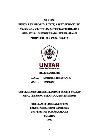 Julio, Marcell (2023) PENGARUH PROFITABILITY, ASSET STRUCTURE, FREE CASH FLOW DAN LEVERAGE TERHADAP FINANCIAL DISTRESS PADA PERUSAHAAN PROPERTI DAN REAL ESTATE. Skripsi thesis, Universitas Tarumanagara.