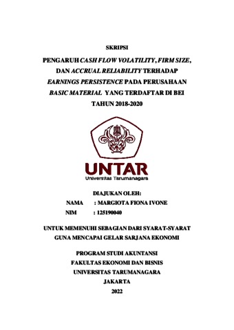 Fiona, Margiota (2022) PENGARUH CASH FLOW VOLATILITY, FIRM SIZE, DAN ACCRUAL RELIABILITY TERHADAP EARNINGS PERSISTENCE PADA PERUSAHAAN BASIC MATERIAL YANG TERDAFTAR DI BEI TAHUN 2018-2020. Skripsi thesis, Universitas Tarumanagara.