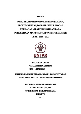 Halda, Meilina (2022) PENGARUH PERTUMBUHAN PERUSAHAAN, PROFITABILITAS, DAN STRUKTUR MODAL TERHADAP NILAI PERUSAHAAN PADA PERUSAHAAN MANUFAKTUR YANG TERDAFTAR DI BEI 2019 - 2021. Skripsi thesis, Universitas Tarumanagara.