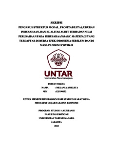 Amelita, Melania (2022) PENGARUH STRUKTUR MODAL, PROFITABILITAS, UKURAN PERUSAHAAN, DAN KUALITAS AUDIT TERHADAP NILAI PERUSAHAAN PADA PERUSAHAAN BASIC MATERIALS YANG TERDAFTAR DI BURSA EFEK INDONESIA SEBELUM DAN DI MASA PANDEMI COVID-19. Skripsi thesis, Universitas Tarumanagara.