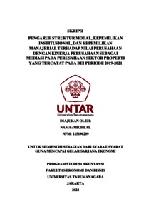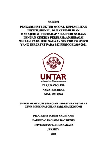 Michael, Michael (2022) PENGARUH STRUKTUR MODAL, KEPEMILIKAN INSTITUSIONAL, DAN KEPEMILIKAN MANAJERIAL TERHADAP NILAI PERUSAHAAN DENGAN KINERJA PERUSAHAAN SEBAGAI MEDIASI PADA PERUSAHAAN SEKTOR PROPERTI YANG TERCATAT PADA BEI PERIODE 2019-2021. Skripsi thesis, Universitas Tarumanagara.