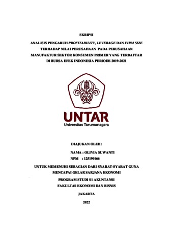 Suwanti, Olivia (2022) ANALISIS PENGARUH PROFITABILITY, LEVERAGE DAN FIRM SIZE TERHADAP NILAI PERUSAHAAN PADA PERUSAHAAN MANUFAKTUR SEKTOR KONSUMEN PRIMER YANG TERDAFTAR DI BURSA EFEK INDONESIA PERIODE 2019-2021. Skripsi thesis, Universitas Tarumanagara.