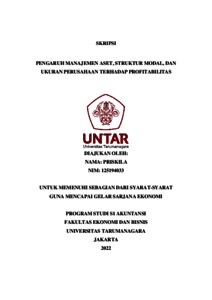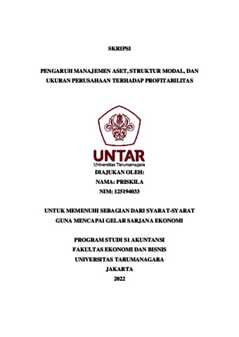 Priskila, Priskila (2022) PENGARUH MANAJEMEN ASET, STRUKTUR MODAL, DAN UKURAN PERUSAHAAN TERHADAP PROFITABILITAS. Skripsi thesis, Universitas Tarumanagara.