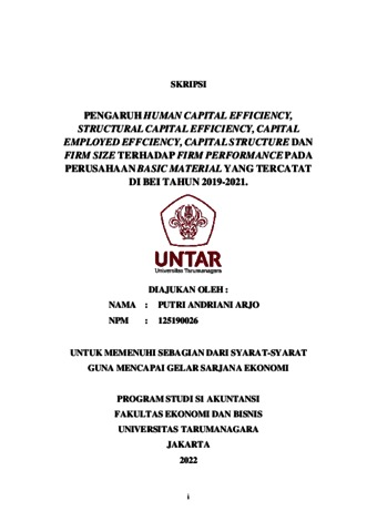 Andriani, Putri (2022) PENGARUH HUMAN CAPITAL EFFICIENCY, STRUCTURAL CAPITAL EFFICIENCY, CAPITAL EMPLOYED EFFCIENCY, CAPITAL STRUCTURE DAN FIRM SIZE TERHADAP FIRM PERFORMANCE PADA PERUSAHAAN BASIC MATERIAL YANG TERCATAT DI BEI TAHUN 2019-2021. Skripsi thesis, Universitas Taruamanagara.