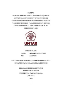 Rustanton, Renard (2023) PENGARUH PROFITABILITY, LEVERAGE, LIQUIDITY, ACTIVITY, DAN INVESTMENT OPPORTUNITY SET TERHADAP FIRM VALUE DENGAN FIRM SIZE SEBAGAI VARIABEL MODERASI PADA PERUSAHAAN SEKTOR CONSUMER CYCLICAL YANG TERDAFTAR DI BEI PERIODE 2017-2021. Skripsi thesis, Universitas Tarumanagara.