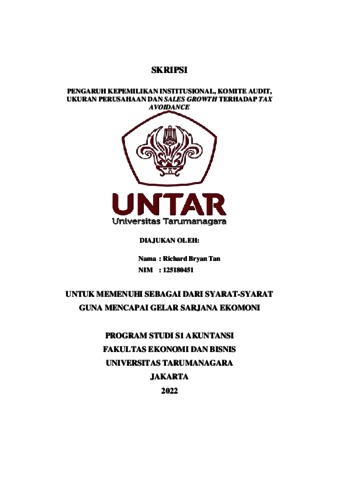 Bryan, Richard (2022) PENGARUH KEPEMILIKAN INSTITUSIONAL, KOMITE AUDIT, UKURAN PERUSAHAAN DAN SALES GROWTH TERHADAP TAX AVOIDANCE. Skripsi thesis, Universitas Tarumanagara.