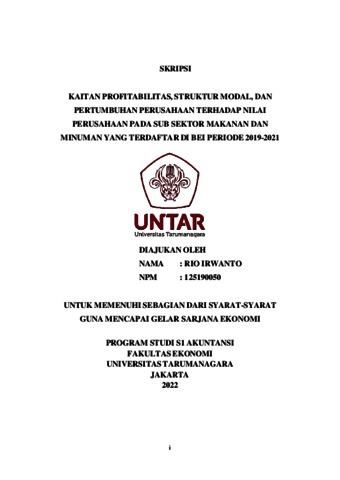 Irwanto, Rio (2022) KAITAN PROFITABILITAS, STRUKTUR MODAL, DAN PERTUMBUHAN PERUSAHAAN TERHADAP NILAI PERUSAHAAN PADA SUB SEKTOR MAKANAN DAN MINUMAN YANG TERDAFTAR DI BEI PERIODE 2019-2021. Skripsi thesis, Universitas Tarumanagara.